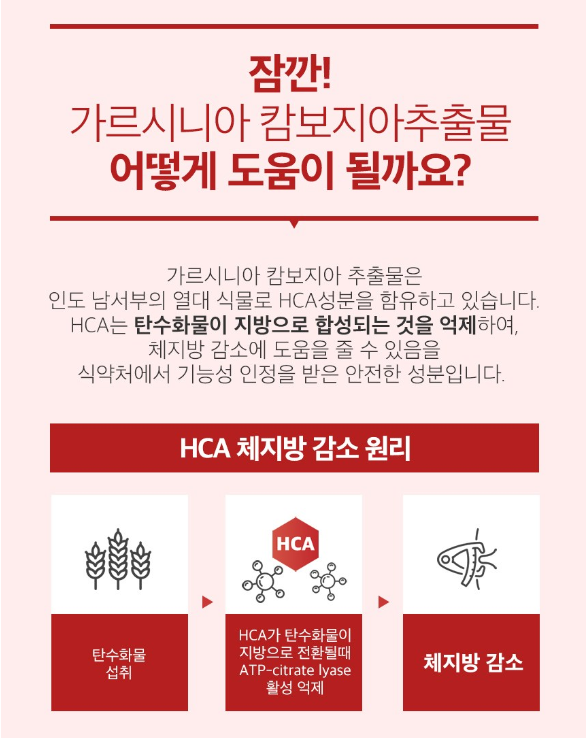 가르시니아 캄보지아의 HCA 성분은 탄수화물이 지방으로 합성되는 것을 억제하여 체지방 감소에 도움을 줍니다. 식사 전 섭취로 식욕 조절 효과가 있으며, 적절한 HCA 함량 확인이 중요합니다. 다이어트 보조제로 인기가 높지만 과다 섭취 시 주의가 필요합니다.