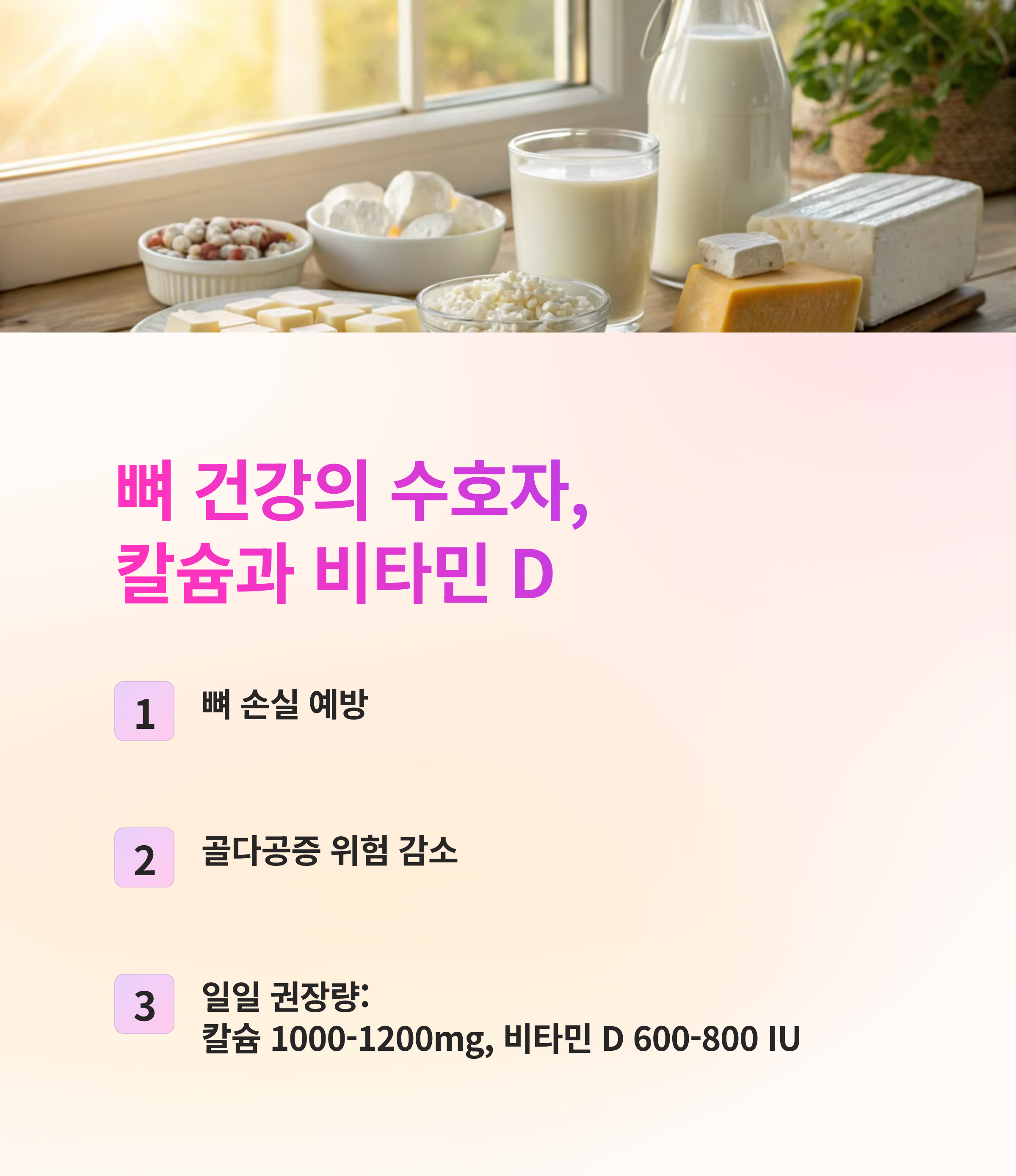 특히 여성들은 50대 이후부터 골밀도가 급격히 감소하기 때문에 하루 1,000~1,200mg의 칼슘을 섭취하는 것이 중요합니다. 또한, 햇빛을 통한 비타민 D 합성이 어려운 경우 비타민 D 보충제를 함께 복용하는 것이 효과적입니다.