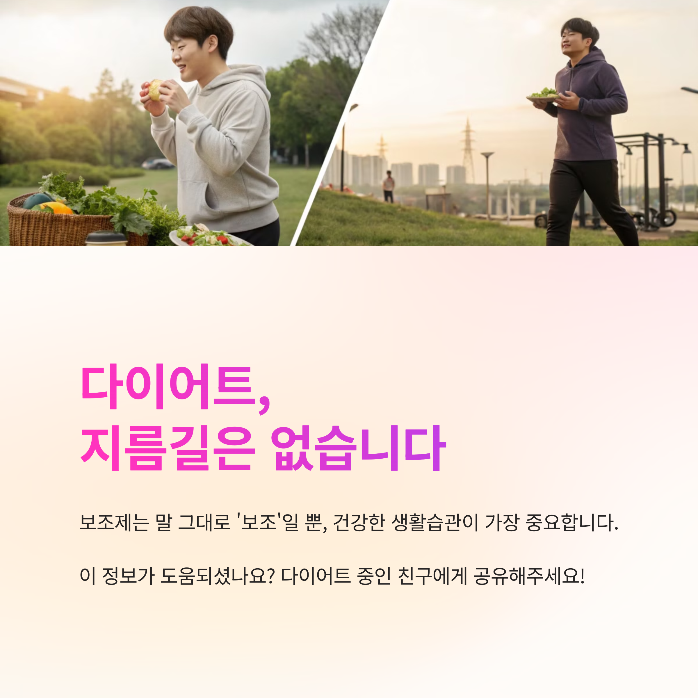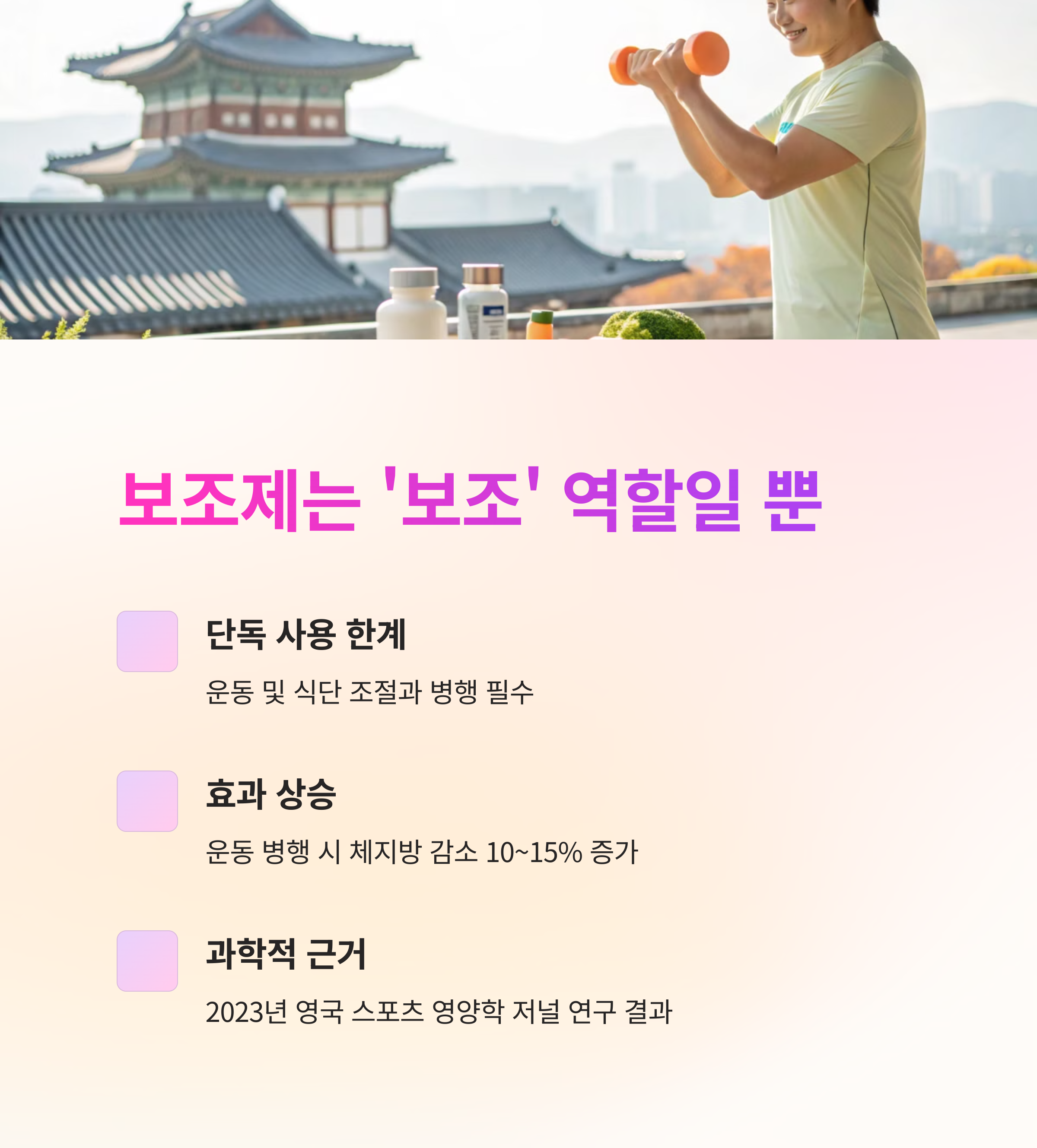 다이어트 보조제는 단독으로 체지방을 감소시키는 것이 아니라 '보조적인 역할'을 한다는 점을 이해하는 것이 중요합니다.