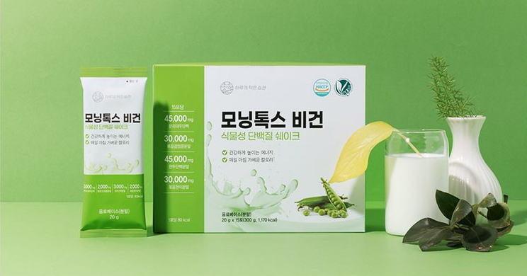 바로 소소습관의 모닝톡스입니다. 완두 단백을 주원료로 한 식물성 단백질 쉐이크로, 아침 식사 대용이나 다이어트용으로 큰 인기를 끌고 있습니다.