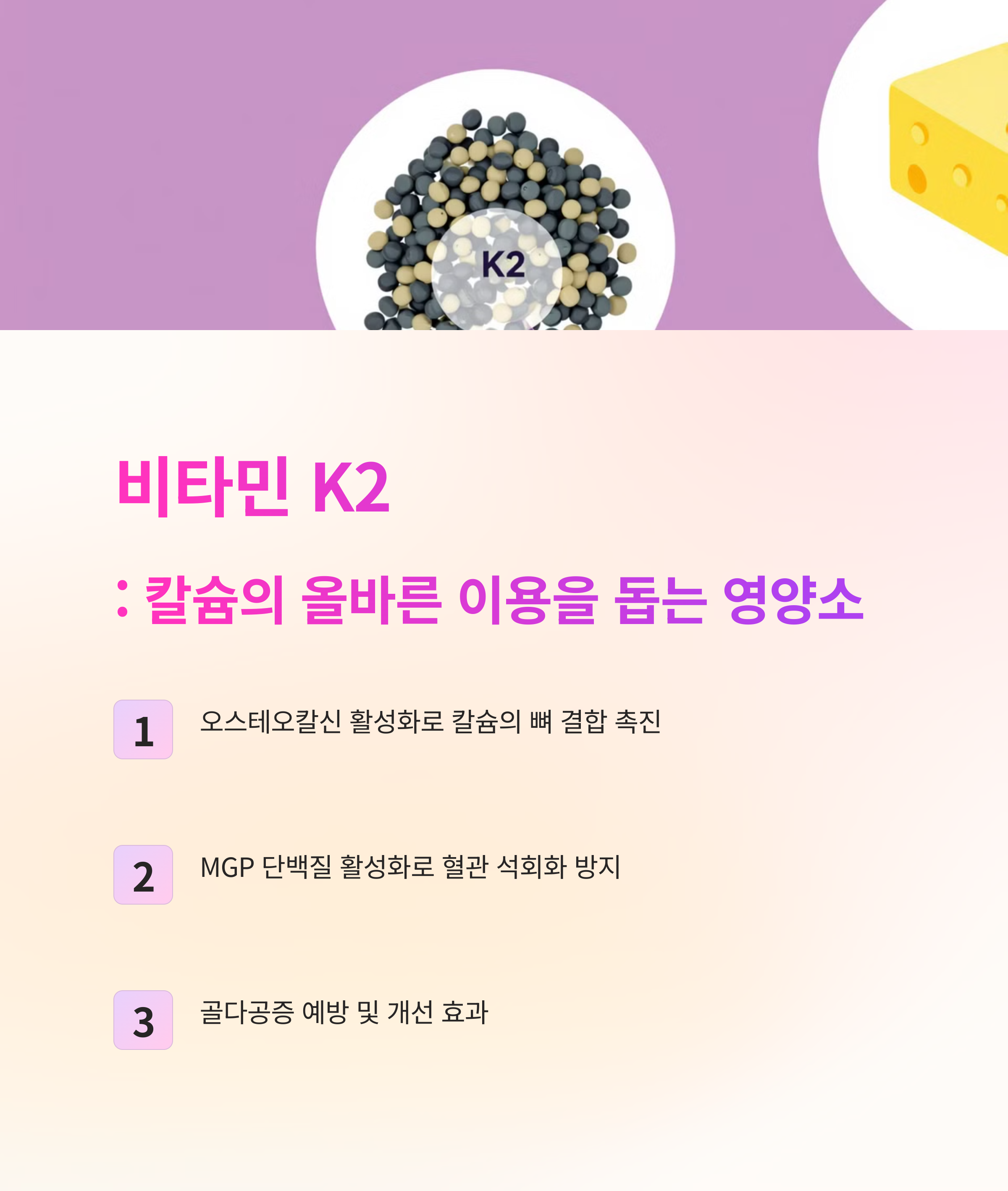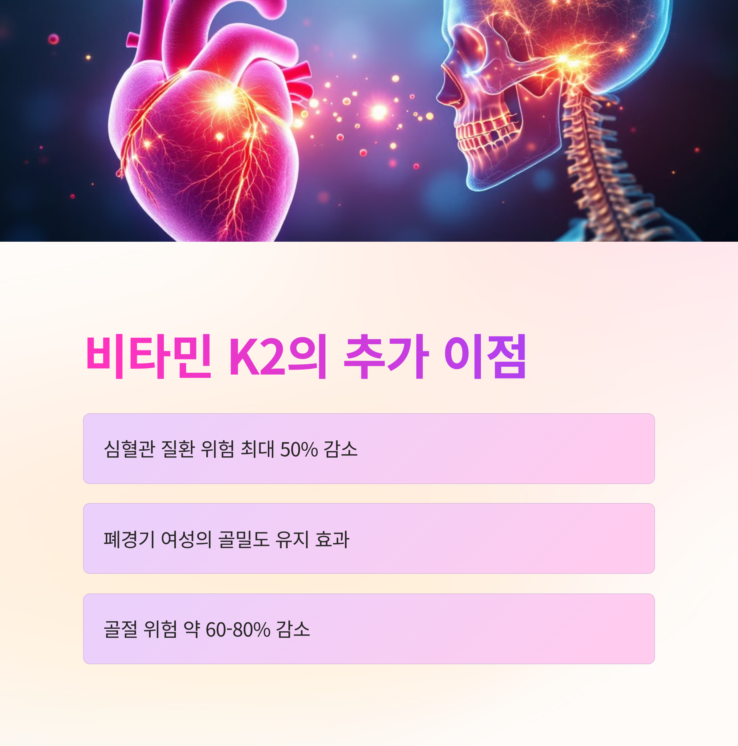 | 비타민 K2 | 칼슘이 뼈에 결합하도록 돕고 혈관 침착을 방지합니다. |