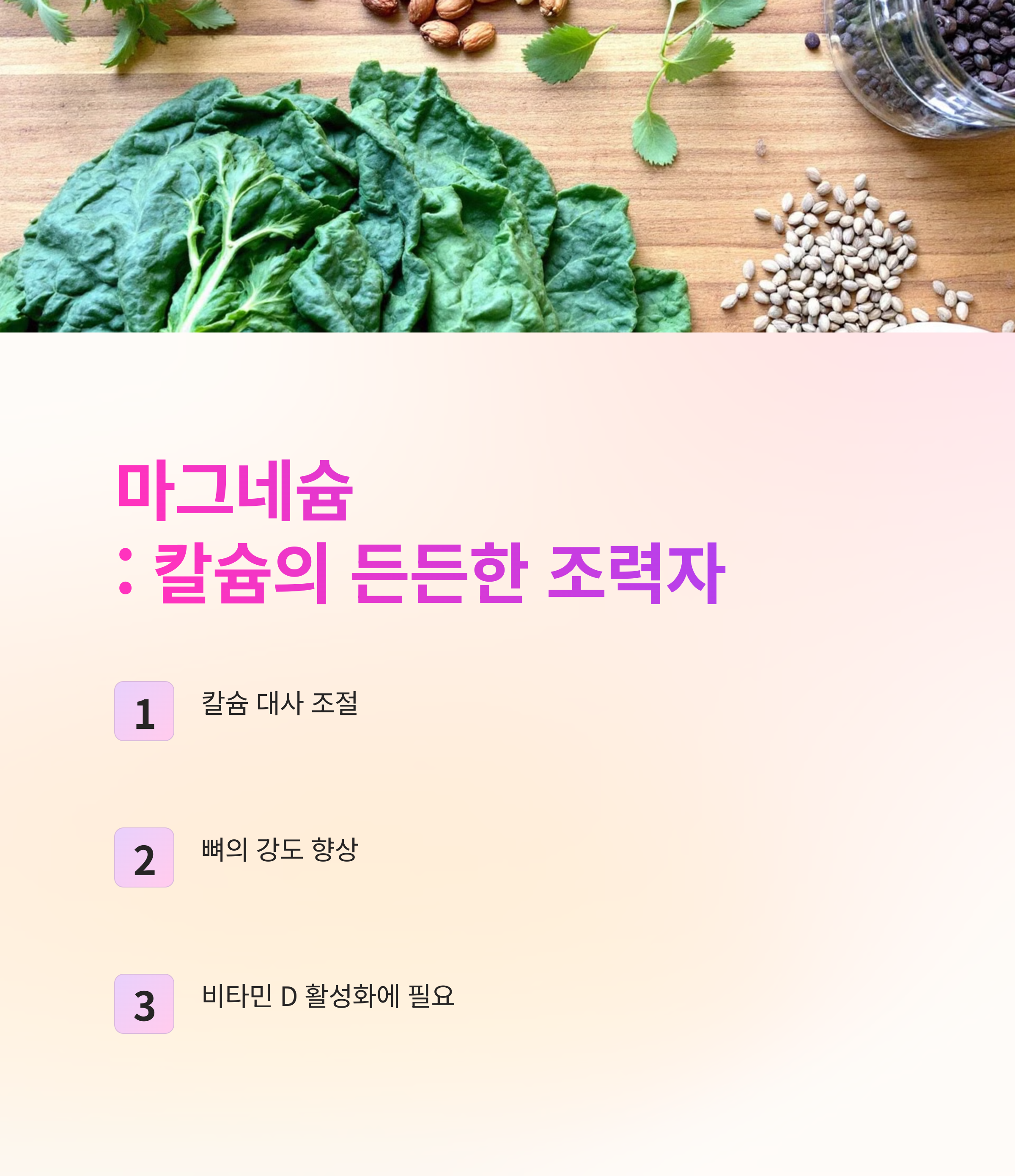 마그네슘은 칼슘의 대사를 조절하고, 뼈의 강도를 높이는 데 중요한 역할을 합니다. 마그네슘이 부족하면 칼슘이 효율적으로 흡수되지 않거나 뼈에 적절히 저장되지 못할 수도 있습니다.