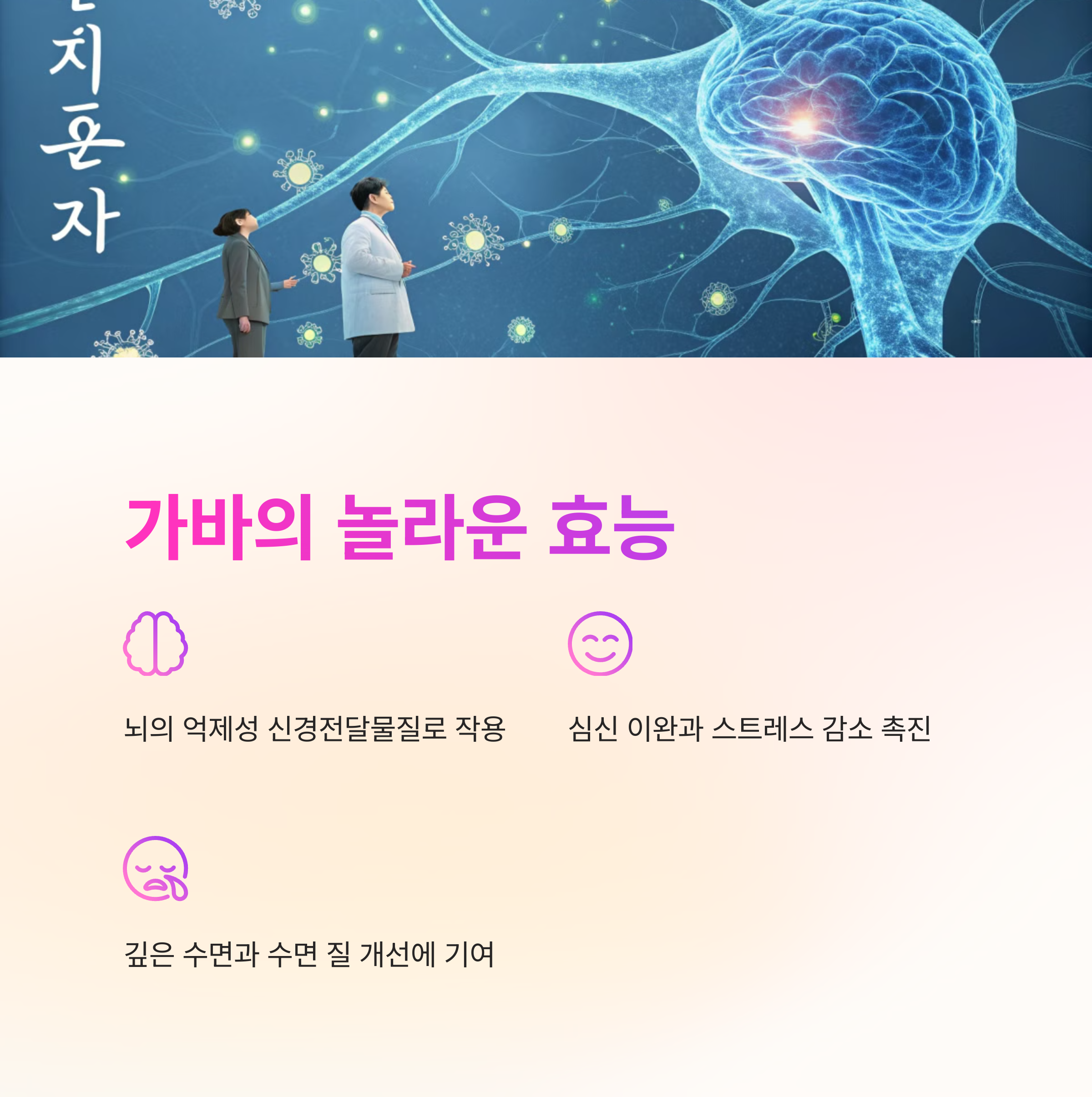 GABA(가바)는 신경을 안정시키고 긴장을 완화하는 억제성 신경전달물질입니다.