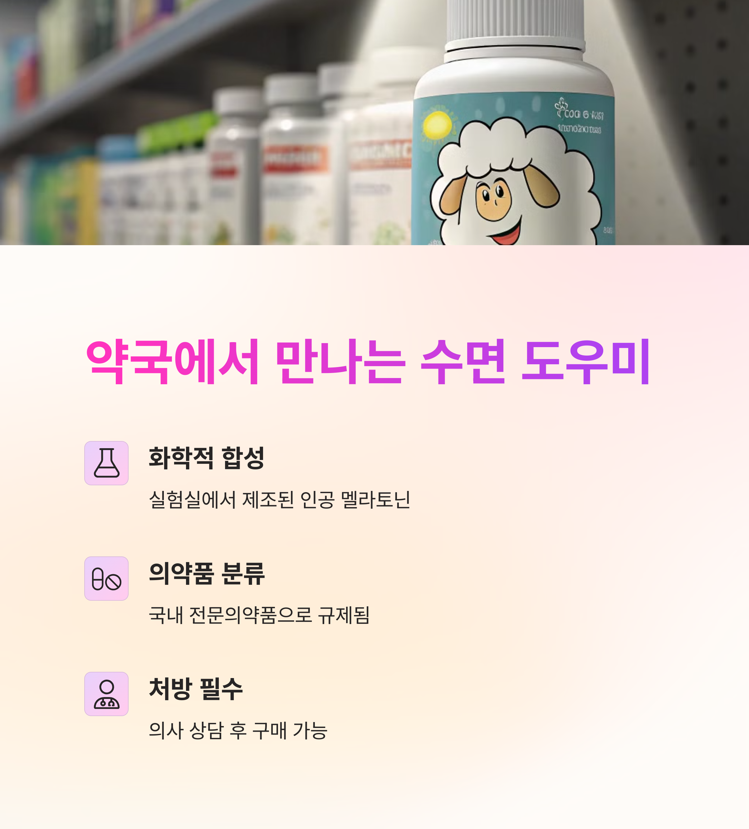 반면, 합성 멜라토닌은 인공적으로 제조된 물질로, 국내에서는 전문의약품으로 분류됩니다.