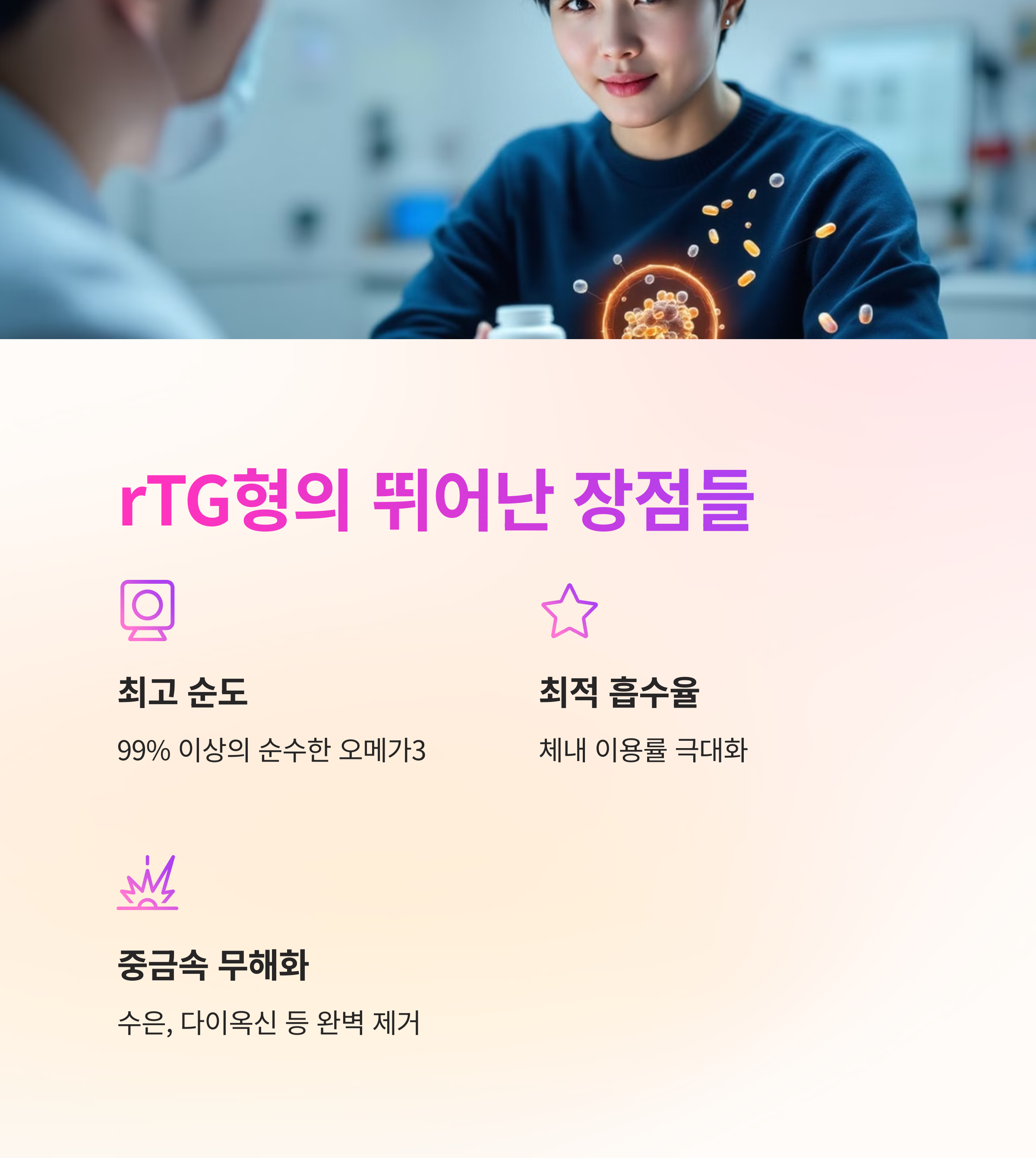 rTG형 오메가3 높은 흡수율과 순도를 가지며 중금속 정제가 효과적.