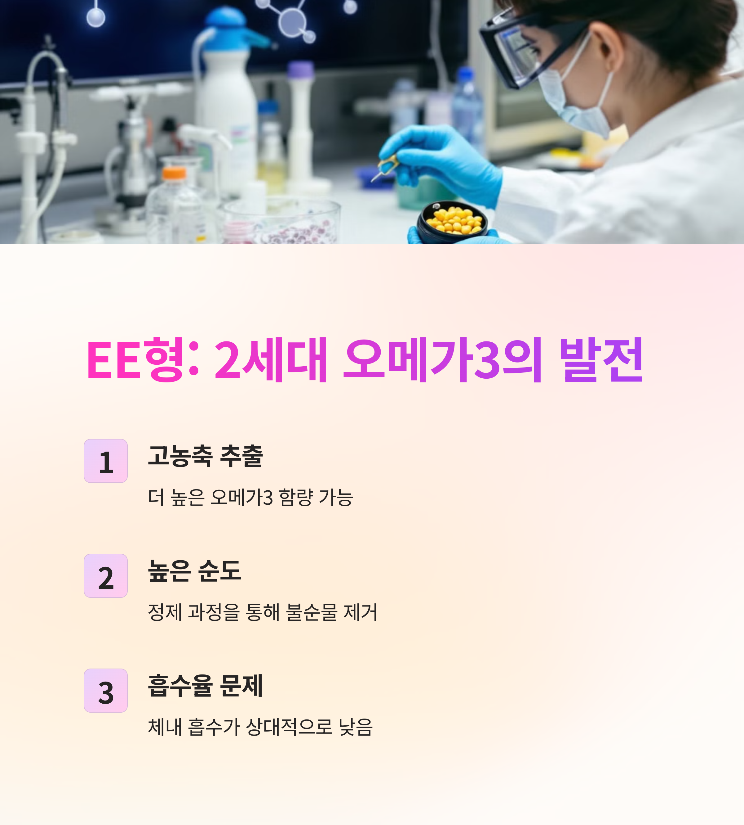 | EE형 오메가3 | 고농축 가능하지만 흡수율이 낮음. |