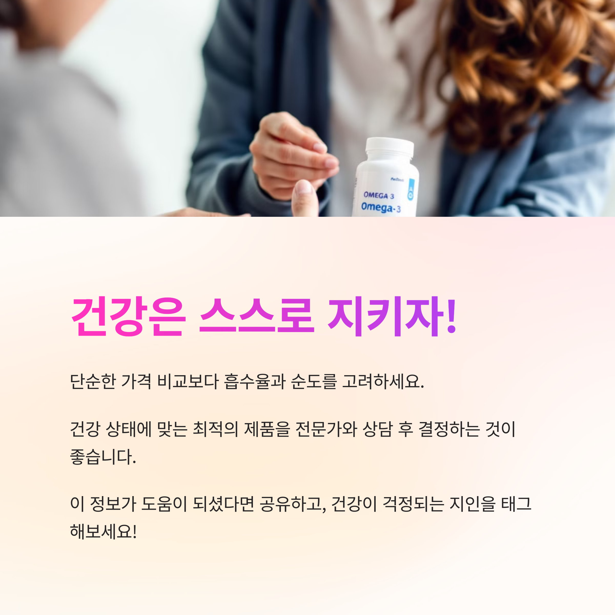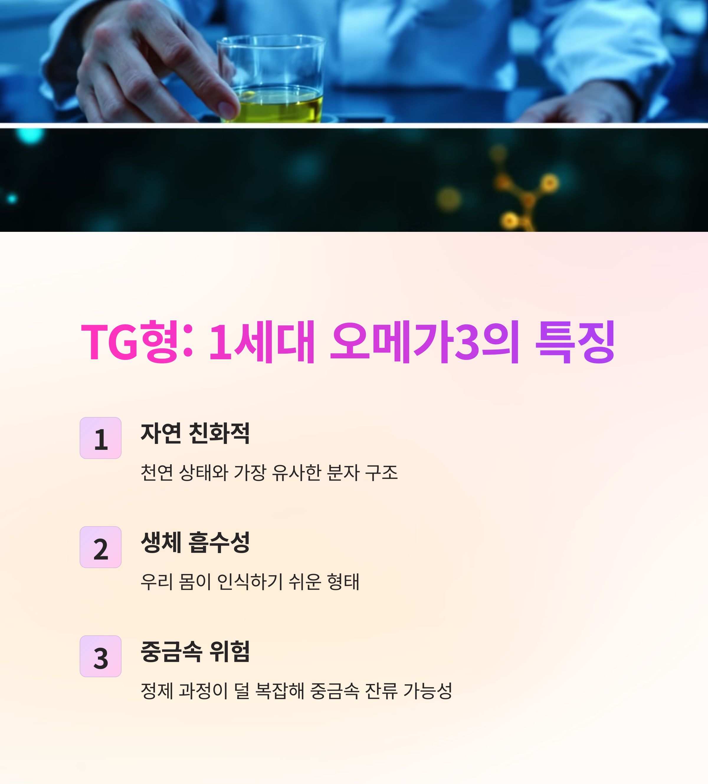 | TG형 오메가3 | 자연 형태로 생체 친화적이나 중금속 잔류 가능성이 있음. |