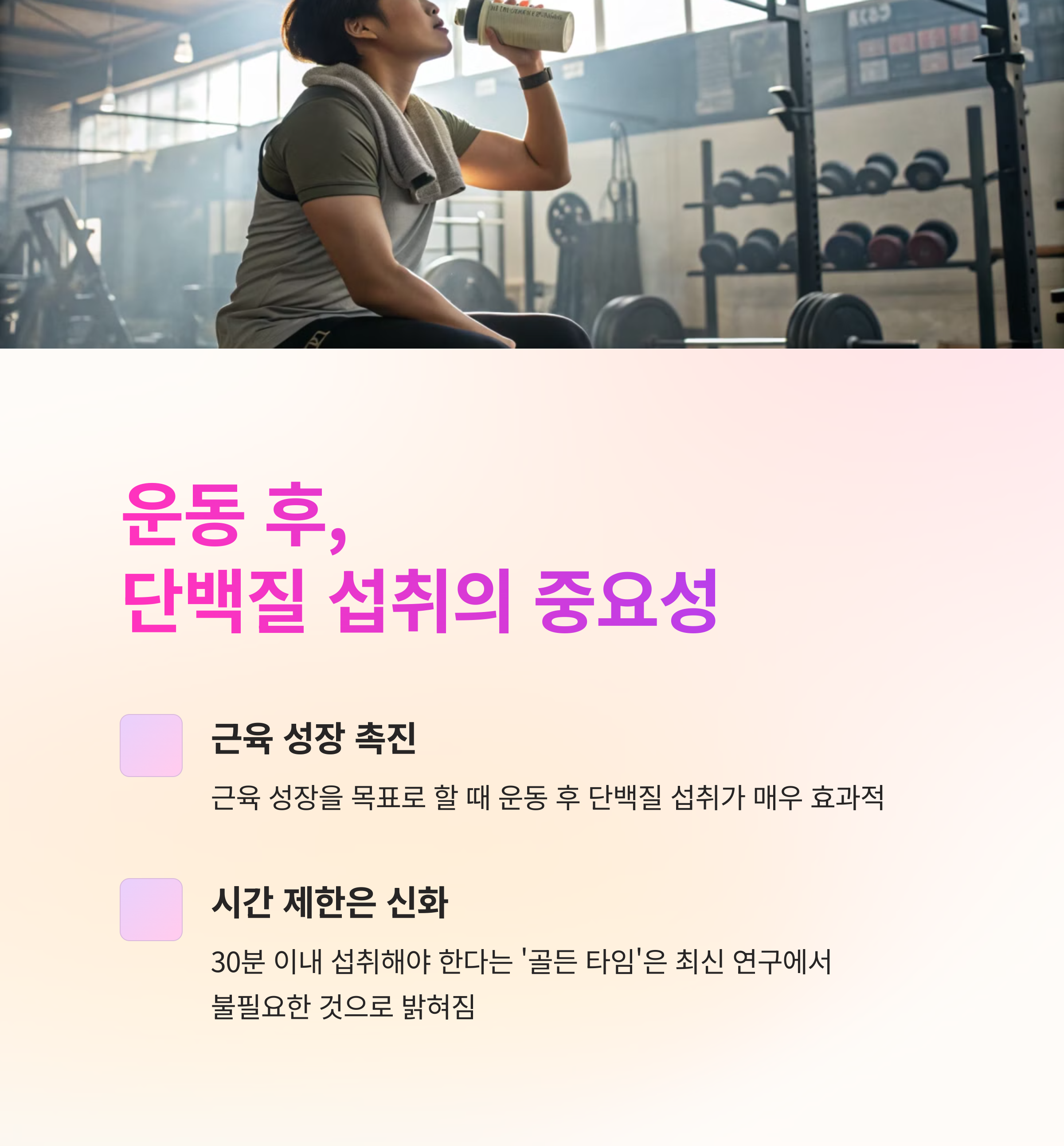 단순히 '운동 후 30분 이내'라는 시간적 제한보다는, 꾸준한 단백질 섭취와 운동 패턴을 고려한 섭취가 중요합니다.