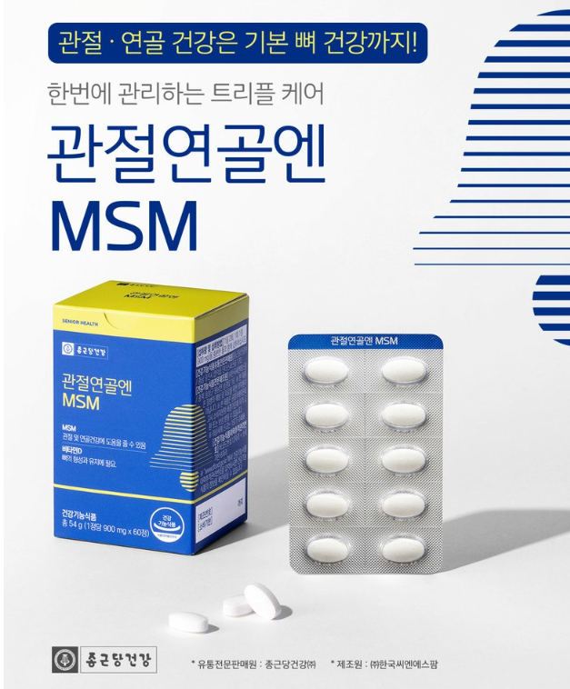 이제는 정말 제가 꼽을 수 있는 최고의 관절 건강 제품을 소개할게요. 종근당건강 관절연골엔 MSM 12개월분!