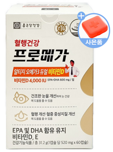 반가워요, 여러분! 금도깨비에요. 오늘은 종근당건강의 혈행건강 프로메가 알티지 오메가3 듀얼 비타민D 제품을 소개할게요. 특별한 이벤트로 헬스판다 알약 케이스도 함께 받을 수 있다고 해서 더욱 흥미롭죠.