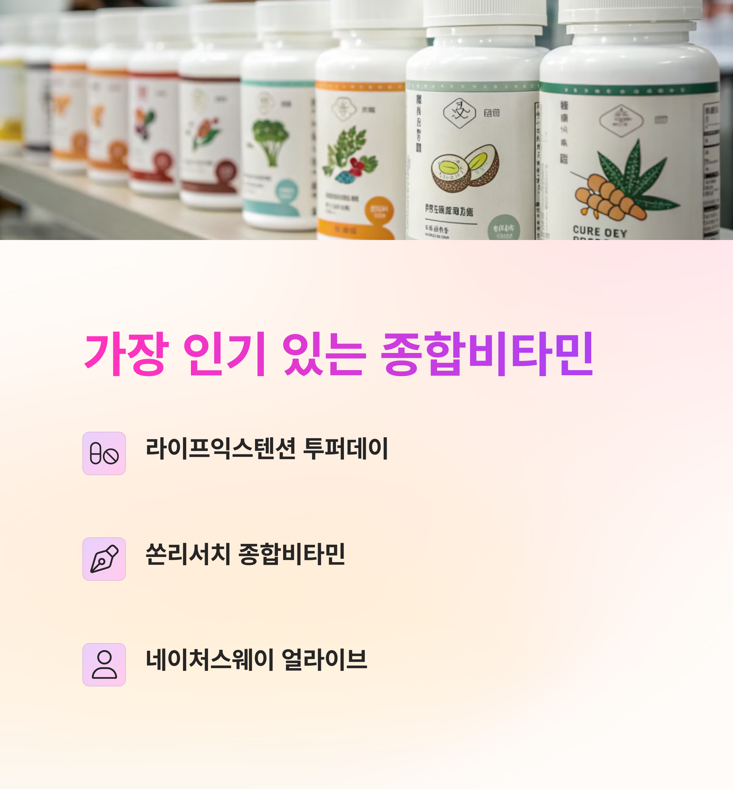 종합비타민 제품 중에서 특히 라이프익스텐션의 투퍼데이, 쏜리서치 종합비타민, 네이처스웨이 얼라이브가 많은 사람들에게 사랑받고 있습니다.