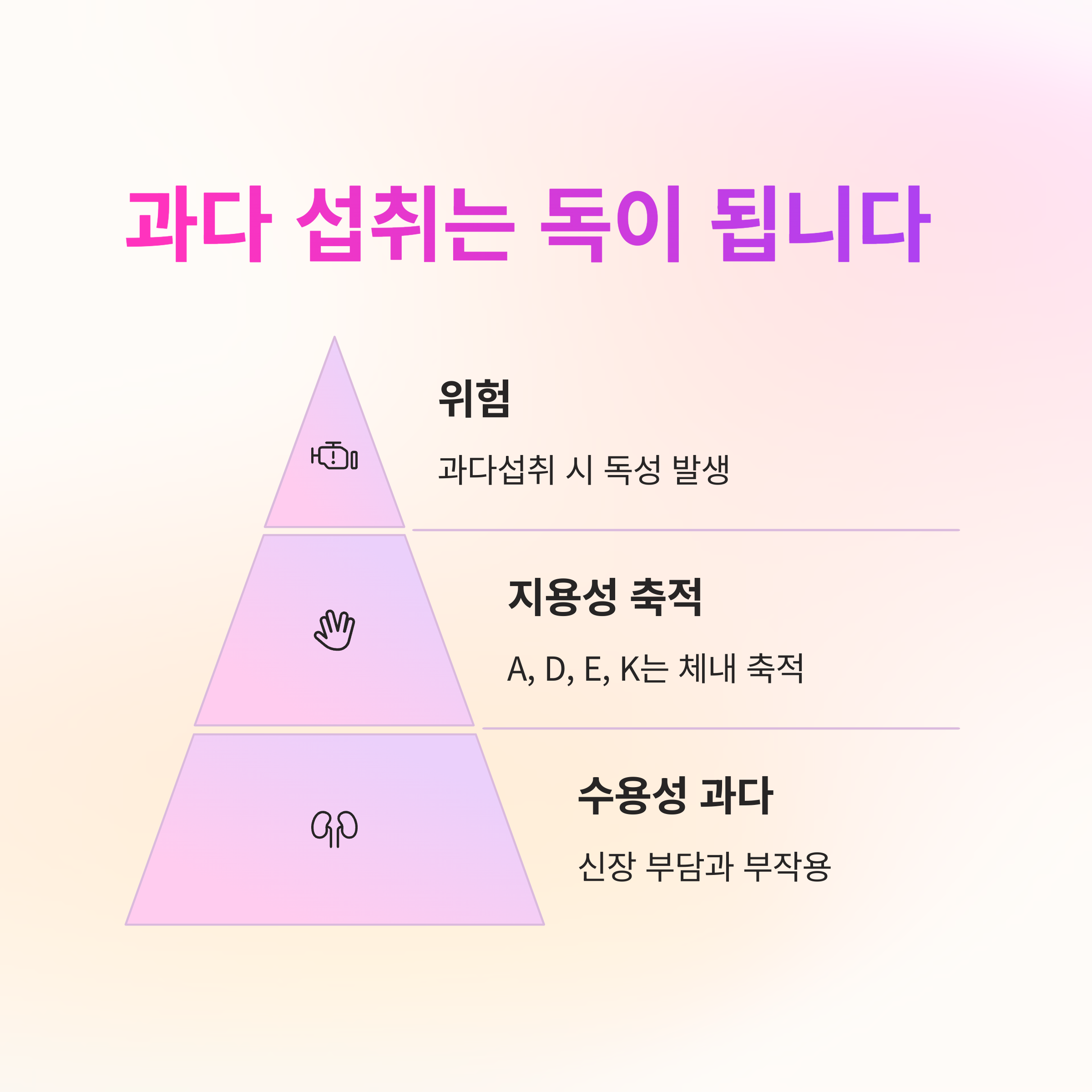 특히, 지용성 비타민(A, D, E, K) 는 몸에 축적될 수 있어 과다 섭취 시 간 손상, 신장 문제 등이 발생할 수 있습니다.