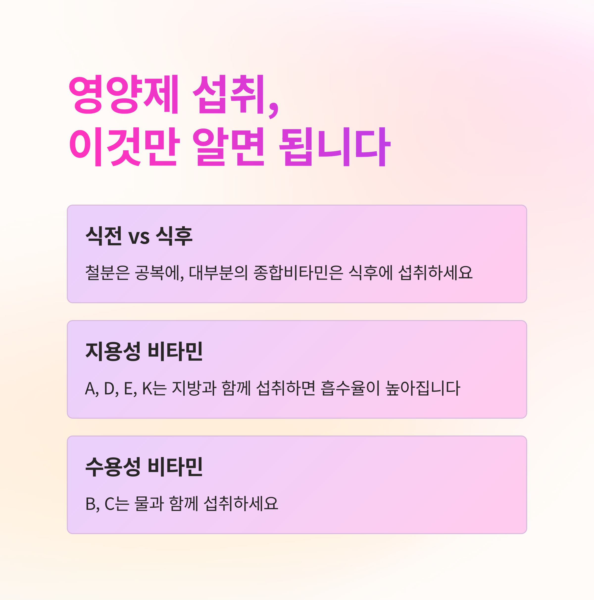 종합비타민과 미네랄을 섭취할 때는 식전과 식후 여부를 고려해야 합니다. 수용성 비타민(B, C 등)은 식전에 섭취해도 괜찮지만, 지용성 비타민(A, D, E, K 등)은 식사 후 지방과 함께 섭취해야 흡수가 잘됩니다. 또한, 과다 섭취는 건강에 해로울 수 있으므로, 제품의 권장량을 초과하지 않도록 주의해야 합니다.