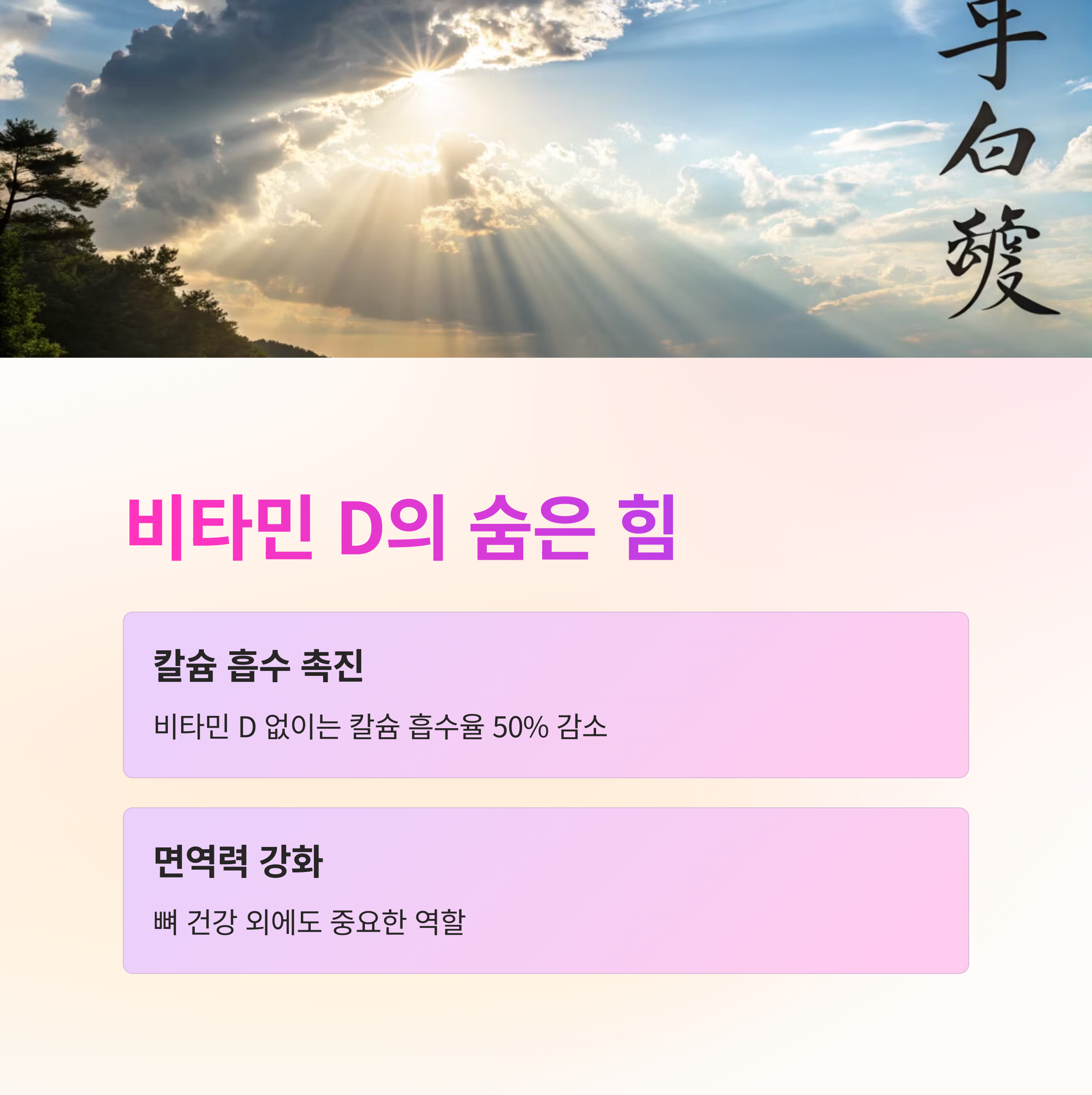 비타민 D는 칼슘의 흡수를 돕는 필수 성분이므로 함께 섭취하면 더욱 효과적입니다.