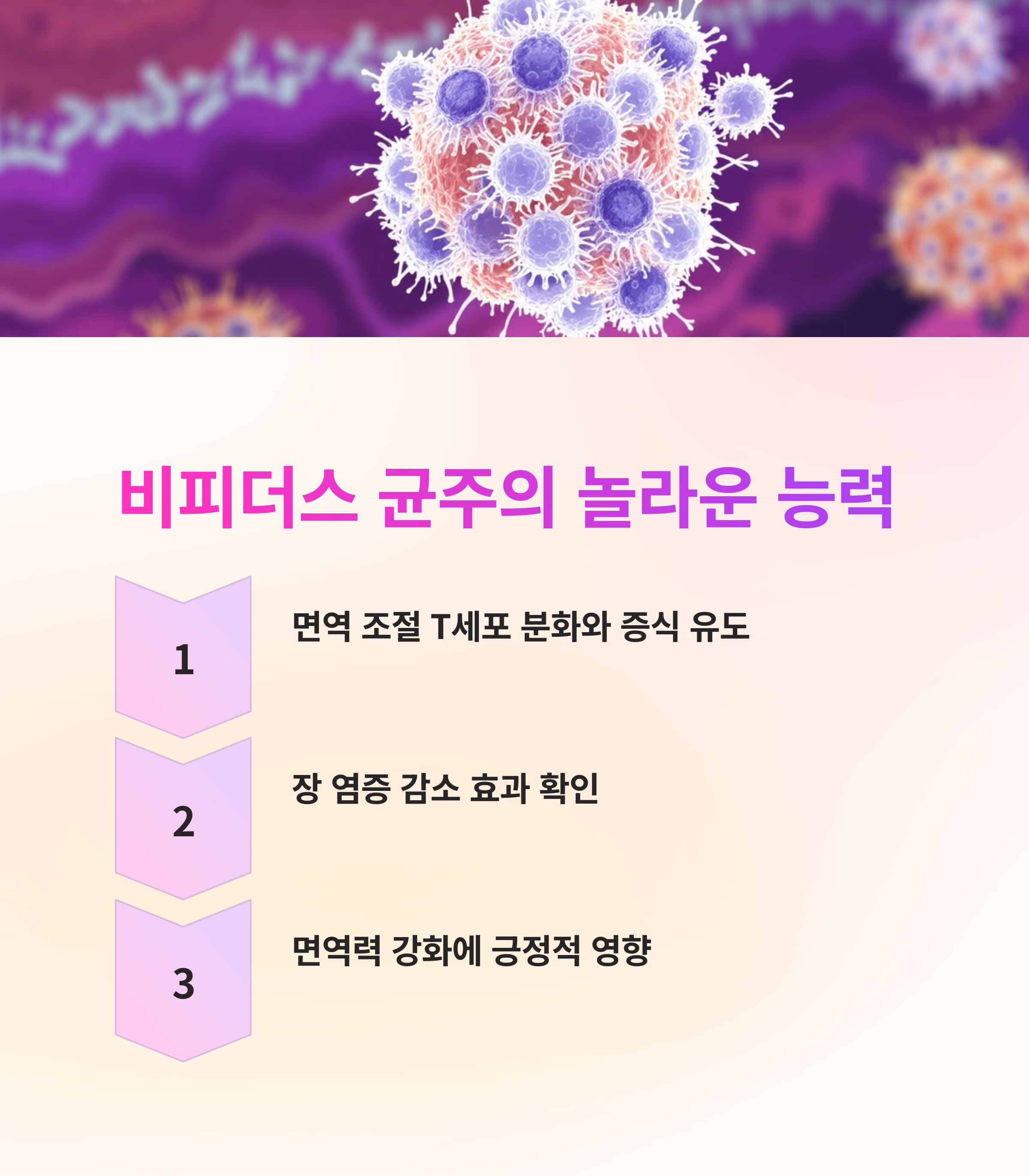 흥미로운 점은, 특정 유산균의 세포 표면 다당체가 직접 면역세포를 조절하고 항염증 효과를 유발할 수 있다는 사실입니다. 이러한 연구 결과는 장내 마이크로바이옴을 활용한 차세대 치료제 개발 가능성을 제시합니다.