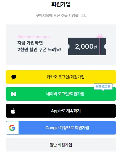 '구매지옥'에서는 회원님께 넘치는 혜택을 제공하고 있어요! 회원가입을 하시면 바로 2000P의 포인트를 드려요. 이 포인트는 다양한 상품 구매나 서비스 이용에 활용하실 수 있습니다. 회원가입은 아래를 참고해 주세요.