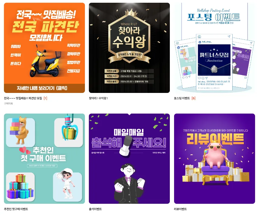 출석 이벤트, 포스팅 이벤트, 리뷰 이벤트 등 다양한 이벤트를 통해 포인트를 더 적립하실 수 있습니다. 이런 방법으로, '구매지옥'은 회원님들에게 다양한 혜택을 드려요. 우리는 회원님의 만족도를 높이는데 최선을 다하고 있습니다!