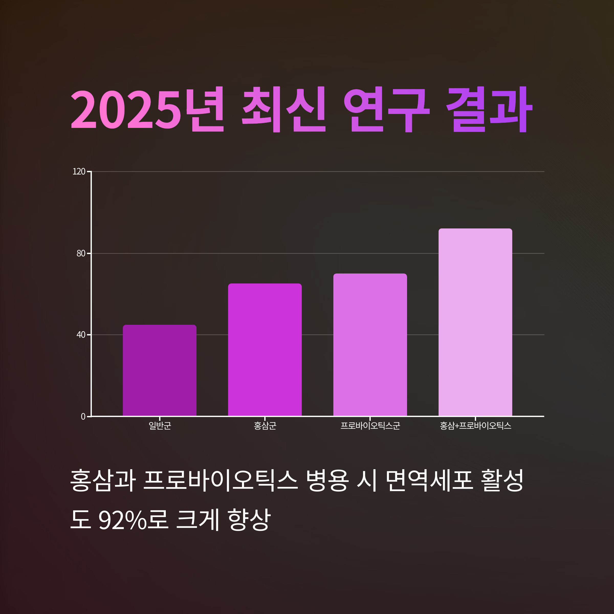 최근 연구에 따르면, 홍삼과 프로바이오틱스를 함께 섭취하면 면역력을 극대화하는 효과를 얻을 수 있다고 합니다. 홍삼은 장내 유익균을 증식시키고, 프로바이오틱스는 건강한 장 환경을 조성하여 소화기 건강과 면역력을 동시에 향상시킬 수 있습니다.