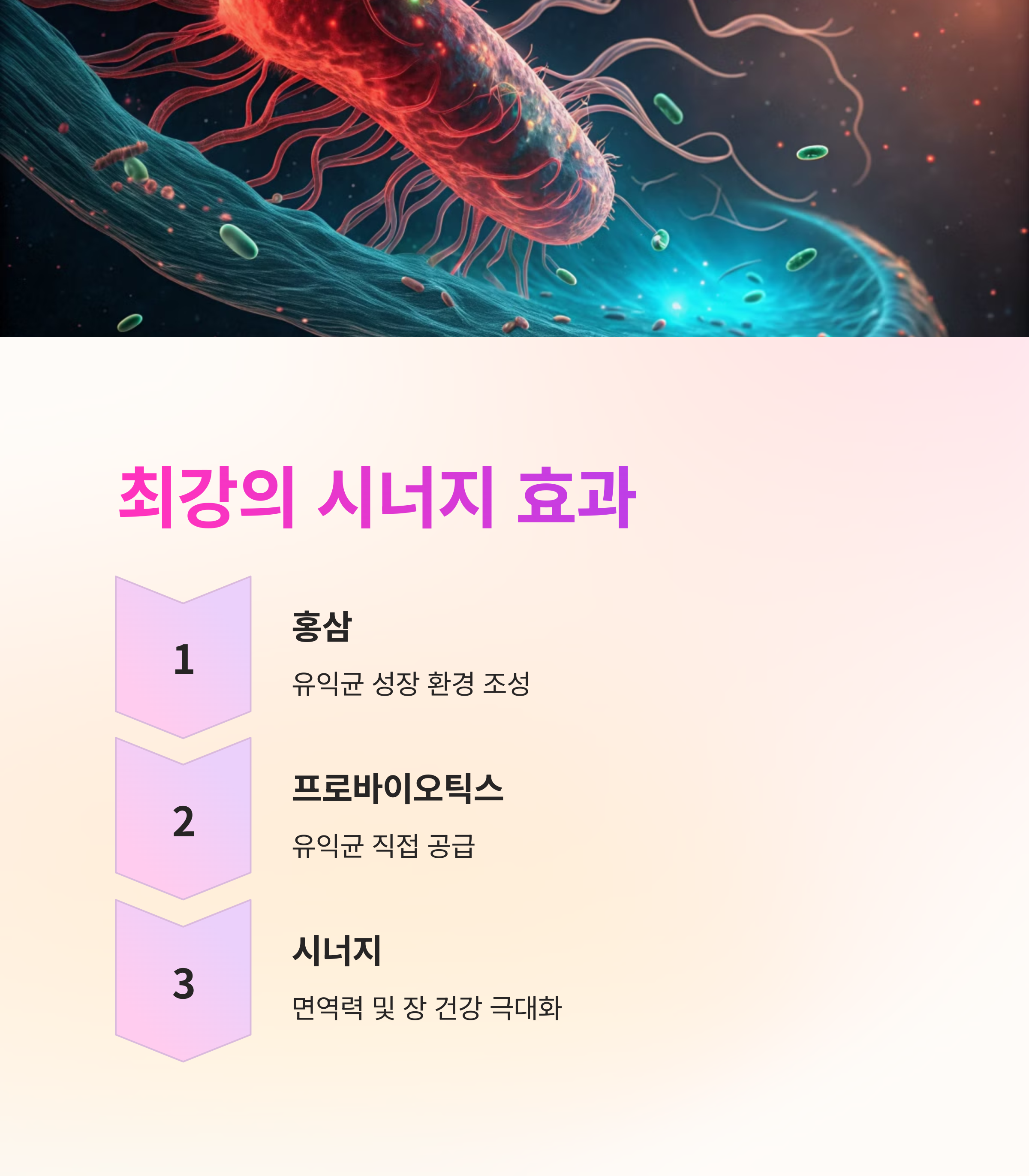 홍삼이 장내 환경을 개선하는 프리바이오틱스 역할을 하면서 프로바이오틱스의 효능을 극대화하는 시너지 효과를 냅니다.