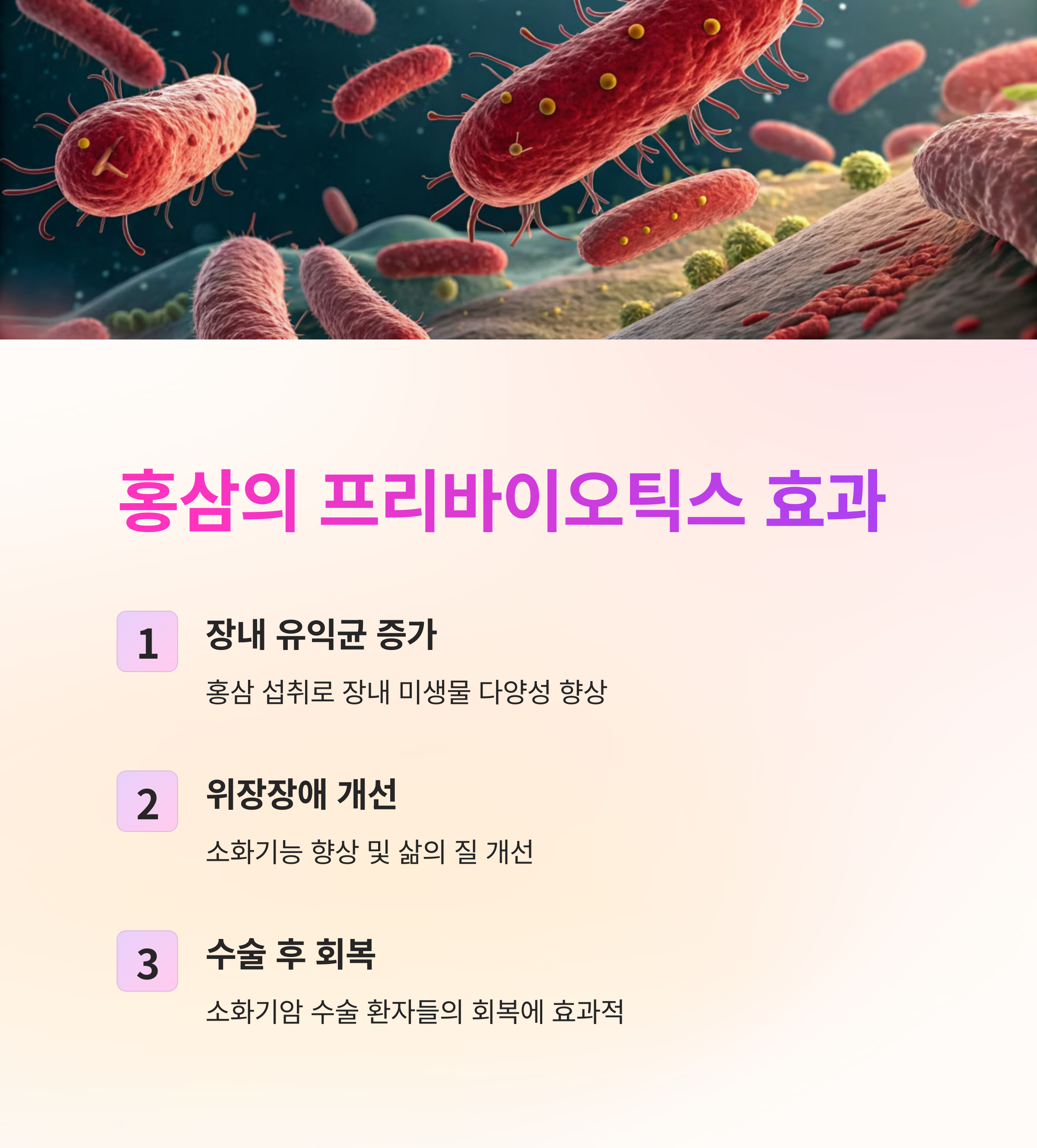 최근 연구에 따르면, 홍삼은 단순한 건강식품이 아니라 장내 환경을 개선하는 강력한 프리바이오틱스 효과를 가지고 있습니다.