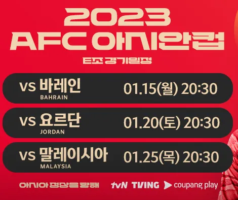 | 2024. 1. 15. (월) 오후 8:30 | 대한민국 vs 바레인 | tvN tvN SPORTS 쿠팡플레이 티빙 |