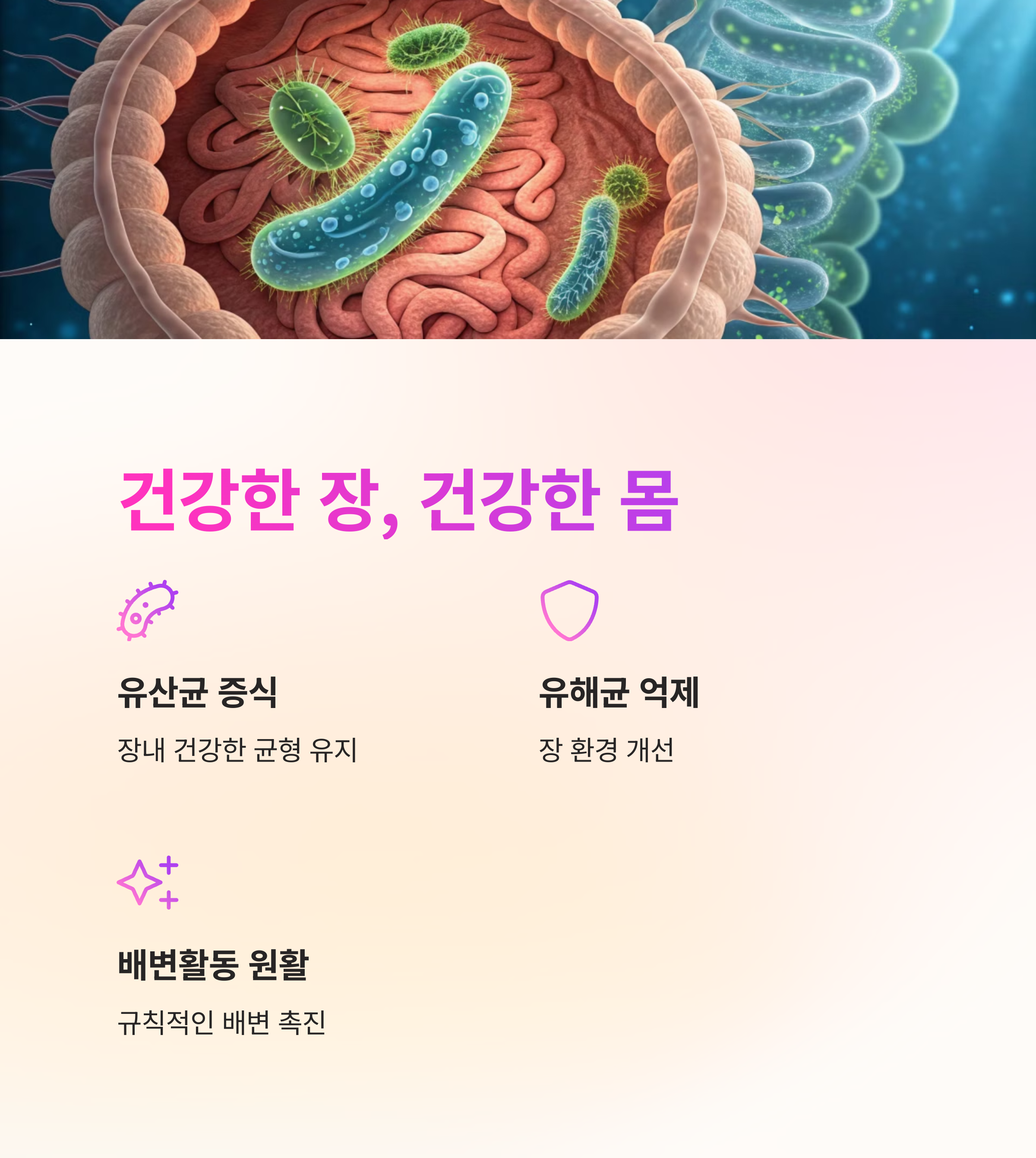 건강한 장내 환경 조성 | 정상적인 세포분열 도움 | 장 기능 개선 및 영양 공급 |