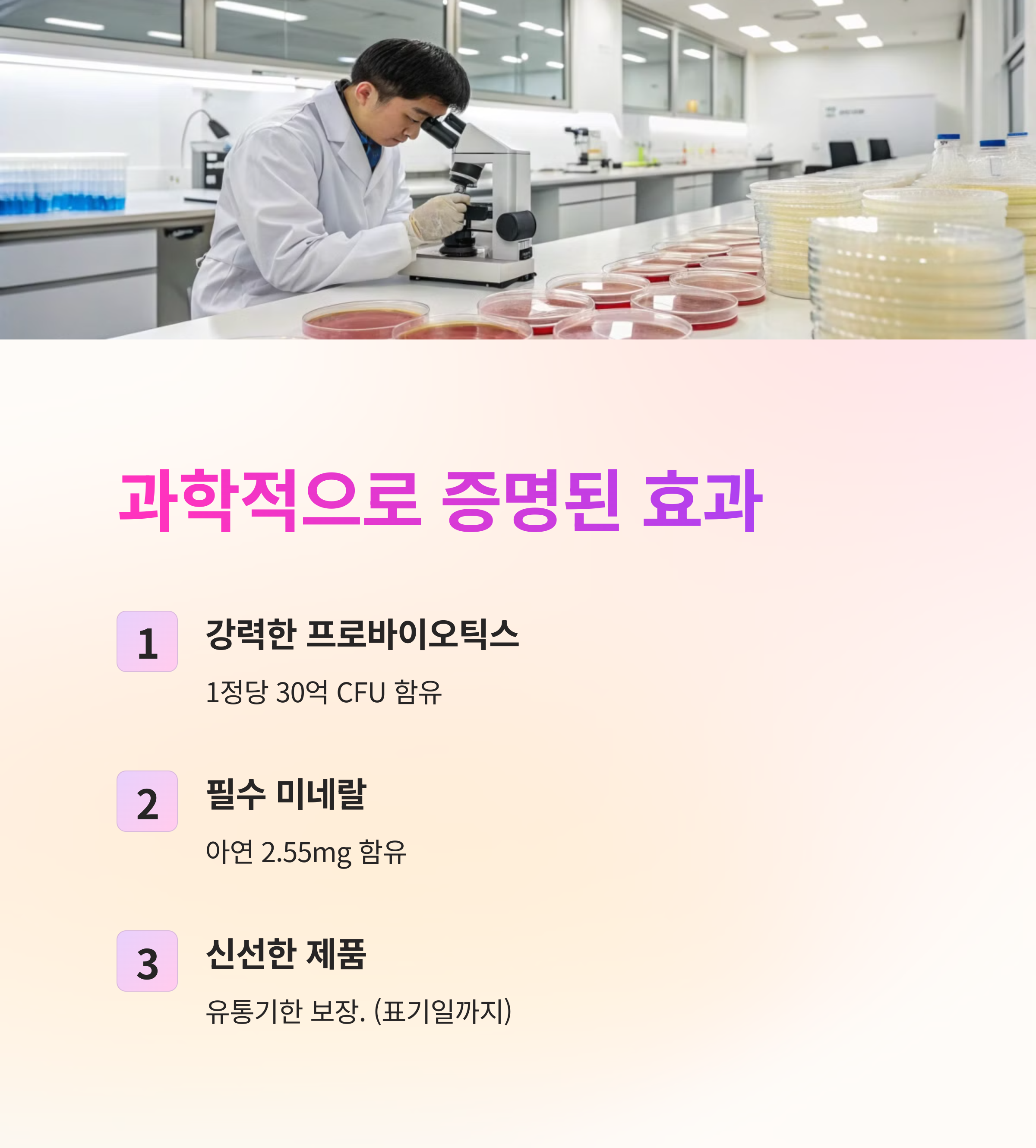 유익균 증식, 유해균 억제 | 아연 함유로 면역력 향상 | 원활한 배변 활동 지원 |