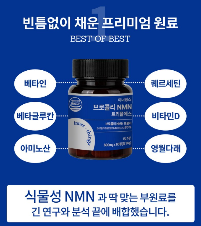 브로콜리 유래 식물성 NMN으로 건강한 노화 대비! 에너지 충전, 세포 회복, 젊음을 되찾고 싶은 분들께 강력 추천하는 이너띵스 NMN 트리플에스. 이 글이 건강관리하시는데 도움이 되었으면 좋겠습니다.
